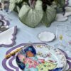 Oval linen placemat with appliqué in white and purple, and with an embroidered scalloped trim.
