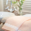 Toalla de invitados confeccionada en lino salmón con aplicación de tira bordada de algodón.