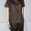 Conjunto de uniforme de servicio con pantalón y casaca confeccionado en un tejido de algodón satinado en color marrón. La casaca tiene un diseño de cuello mao con vivo en color blanco natural.